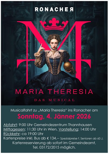 Das Kulturforum Thannhausen lädt ein zu Musicalfahrt "Maria Theresia" nach Wien am Sonntag, 4. Jänner 2026.