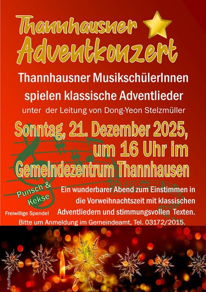 Das Kulturforum Thannhausen lädt zum Adventkonzert der Thannhausner MusikschülerInnen am Sonntag, 21. Dezember 2025.