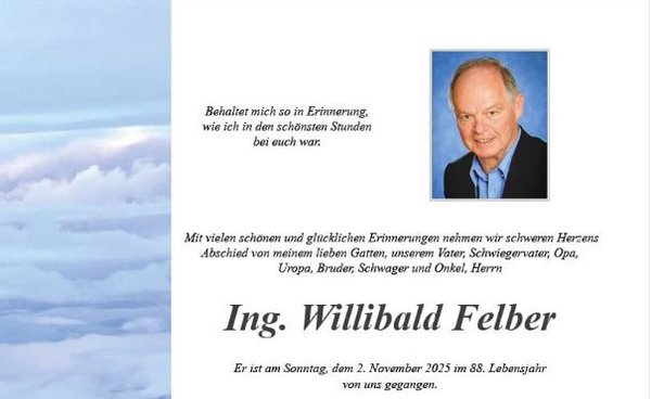 Am 2. November 2025 ist im 88. Lebensjahr unser ehemaliger Gemeinderat Willibald Felber aus Landscha verstorben.
