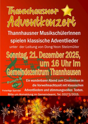 Adventkonzert der Thannhausner MusikschülerInnen unter der Leitung von Dong-Yeon Stelzmüller am Sonntag, 21. Dezember 2025 um 16 Uhr im Gemeindezentrum Thannhausen. Tauchen Sie ein in die vorweihnachtliche Zeit mit Advent- und Weihnachtslieder und stimmungsvollen Texten.