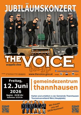 Jubiläumskonzert "The Voice" acapella show am Freitag, 12. Juni 2026 mit Beginn um 19:30 Uhr im Gemeindezentrum Thannhausen. Karten sind erhältlich in der Gemeinde Thannhausen und beim Tourismusverband Weiz (Hauptplatz).