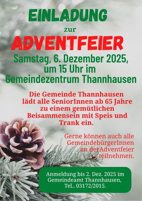 Herzliche Einladung zur SeniorInnen Adventfeier am Samstag, 6. Dezember 2025 um 15 Uhr im Gemeindezentrum Thannhausen. Alle SeniorInnen ab 65 Jahre sind zu einem gemütlichen Beisammensein bei Speis und Trank eingeladen.