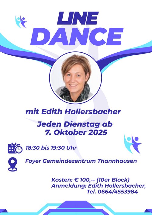 Line Dance ist eine Tanzform, bei der in Reihen und Linien vor- und nebeneinander getanzt wird. Traditionell wird zu Country-Musik getanzt, Edith hat aber auch Choreografien zu aktuellen Hits in ihrem Repertoire. Spaß an der Bewegung mit schwungvoller Musik stehen hier im Vordergrund. Gleichzeitung wird mit Line Dance auch die Koordination trainiert.